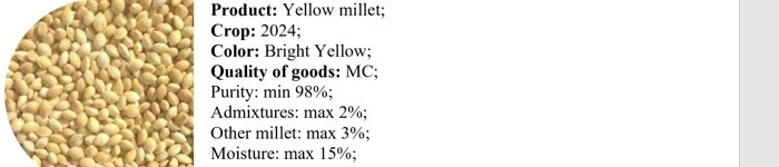 The product is simple. Our product is grown in Bukhara region, Republic of Uzbekistan. This year's grain. Our product is purified, sifted, and has a unique smell. The size is 2.5-3 mm. The color is yellow. Our product has been tested by Biotest, there is no toxicity. Our millet grain is available in our warehouses. We can provide any amount of millet grain. We provide the necessary certificates and laboratory data for export. We invite entrepreneurs from all countries to cooperate. We are waiting for you at our warehouse.